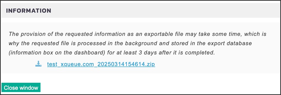 Note: Exporting the requested information may take more than a few seconds (fig. 3). The generated file will be in ZIP format and stored in the export database for at least three days.